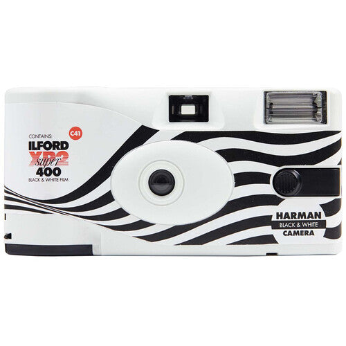 Single use, black & white camera with 27 exposures of XP2 SUPER film and a built-in flash. It can be processed on the high street (in C41 chemistry).
