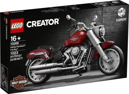 Explore the finer details of iconic engineering with the LEGO? Creator Expert 10269 Harley-Davidson? Fat Boy? motorcycle. Developed in partnership with Harley-Davidson, this highly detailed LEGO motorcycle captures the magic of the real-life machine, from its solid-disc Lakester wheels with beefy tires to its teardrop fuel tank with printed logos and inbuilt speedometer. Other features include a Milwaukee-Eight? engine with moving pistons, dual exhaust pipes, handlebar steering, moveable gearshift pedal and brake levers, kickstand and a sturdy display stand. Finished with a dark red and black color scheme, this amazing display model makes a truly iconic centerpiece for the home or office. This advanced LEGO set provides an immersive and rewarding building experience.