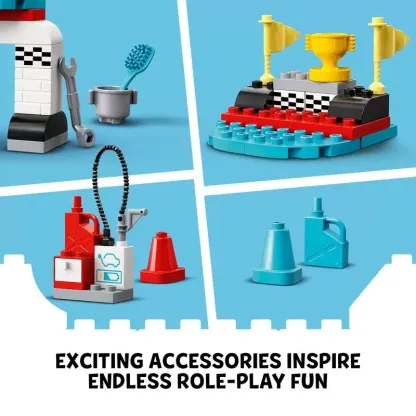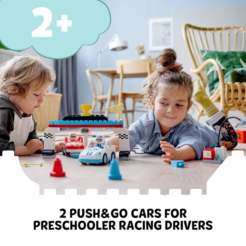 ? Includes male and female DUPLO? racing driver figures with helmets, 2 push-and-go cars, and accessories comprising a trophy, flags, electric vehicle charging, cones and car-care tools.