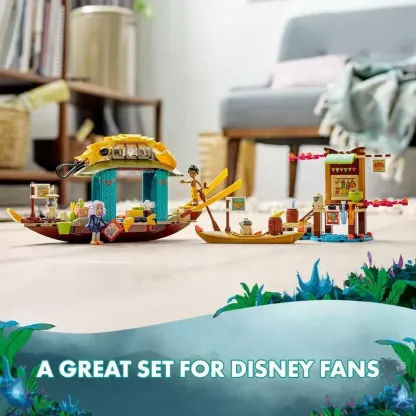 ? This set, based on the new movie Disney��s Raya and the Last Dragon, includes a large shrimp boat, a smaller boat and a dock area, plus Sisu Human and Boun mini-doll figures and 3 Ongi LEGO? figures.