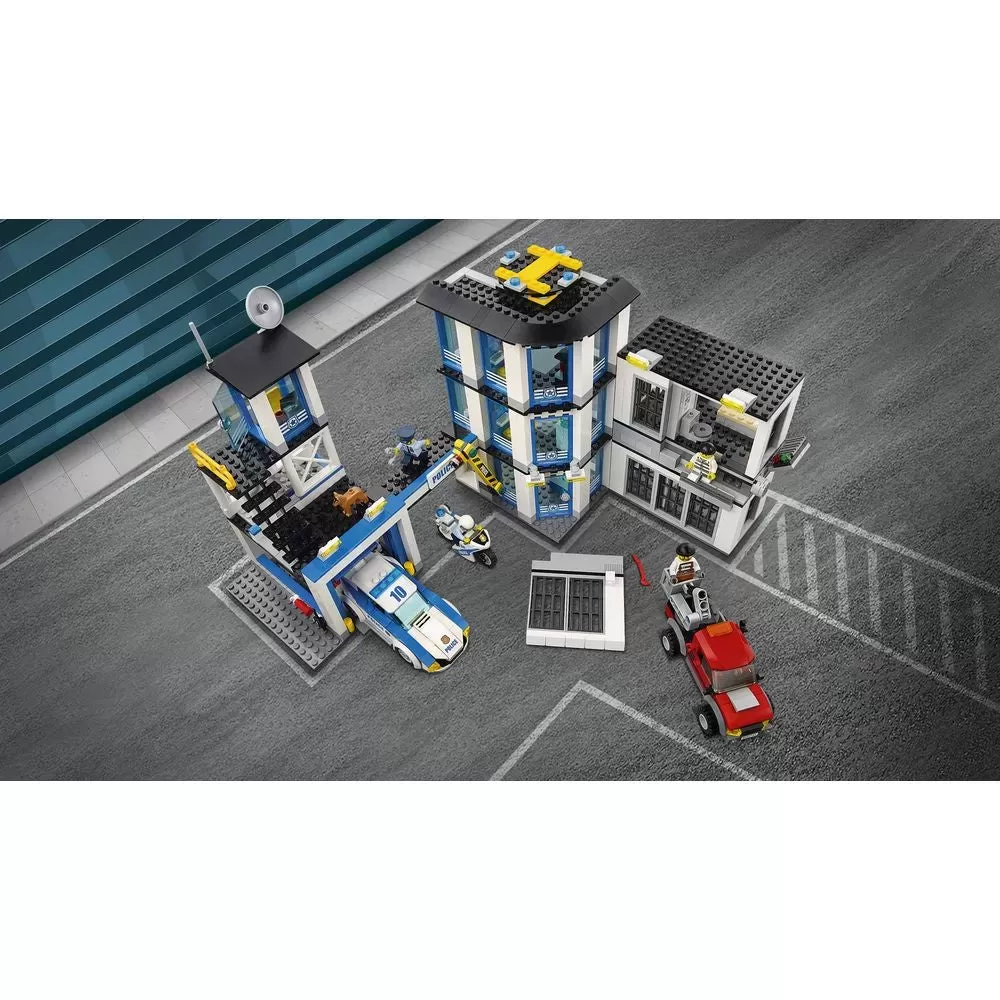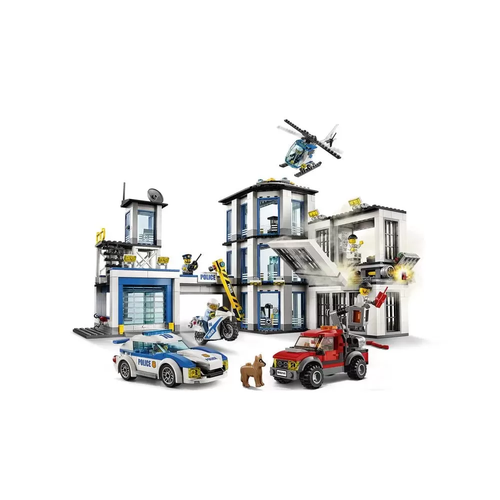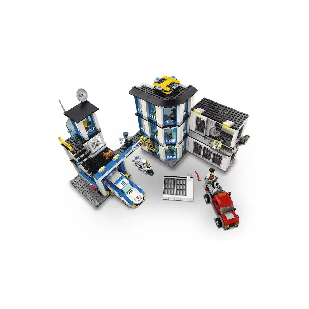 ? Police Station features three levels, including two jail cells with toilets, vent with opening grill and exploding wall function, rooftop helipad, satellite dish and antenna, searchlights, ramp, garage with tools and opening door, watchtower, overhead walkway, three offices and a barrier gate.