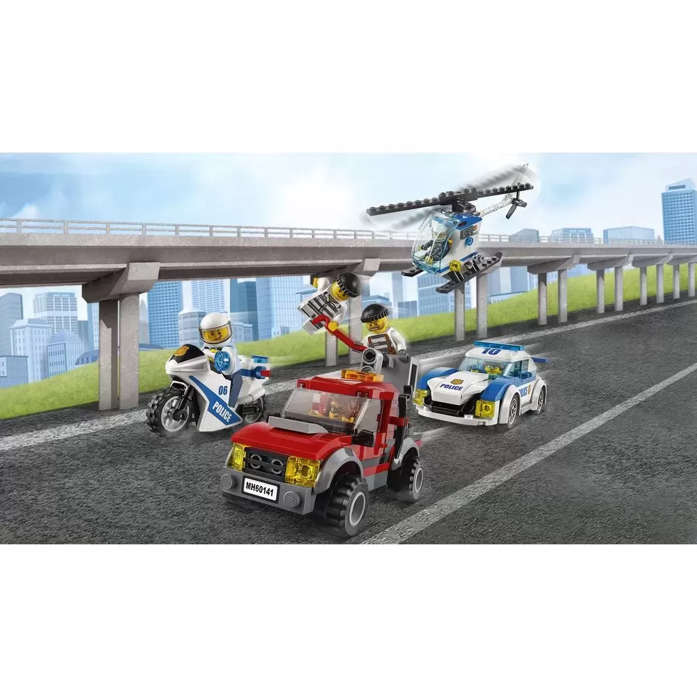 ? Features a three-section Police Station, police helicopter, police pursuit car, police motorbike and crooks' truck.