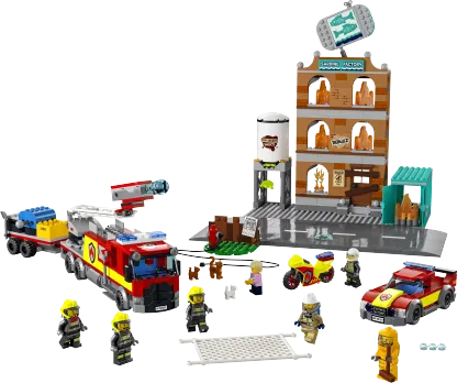 - What��s in the box? �C All kids need to build a toy fire truck, trailer, motorbike, fire pickup, sardine factory fire setting and more, plus 7 minifigures, a cat figure and 2 kitten figures