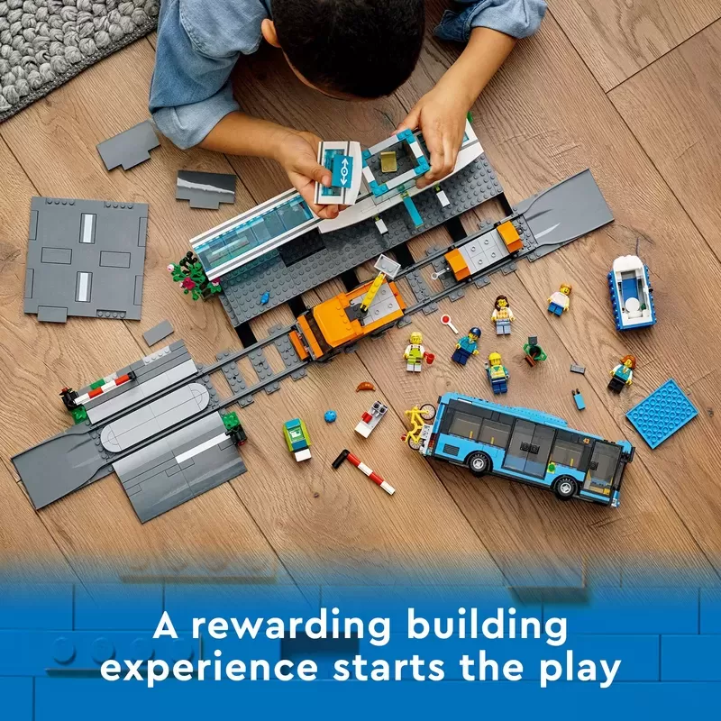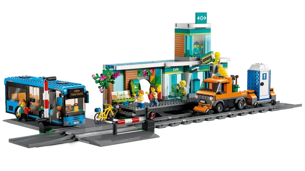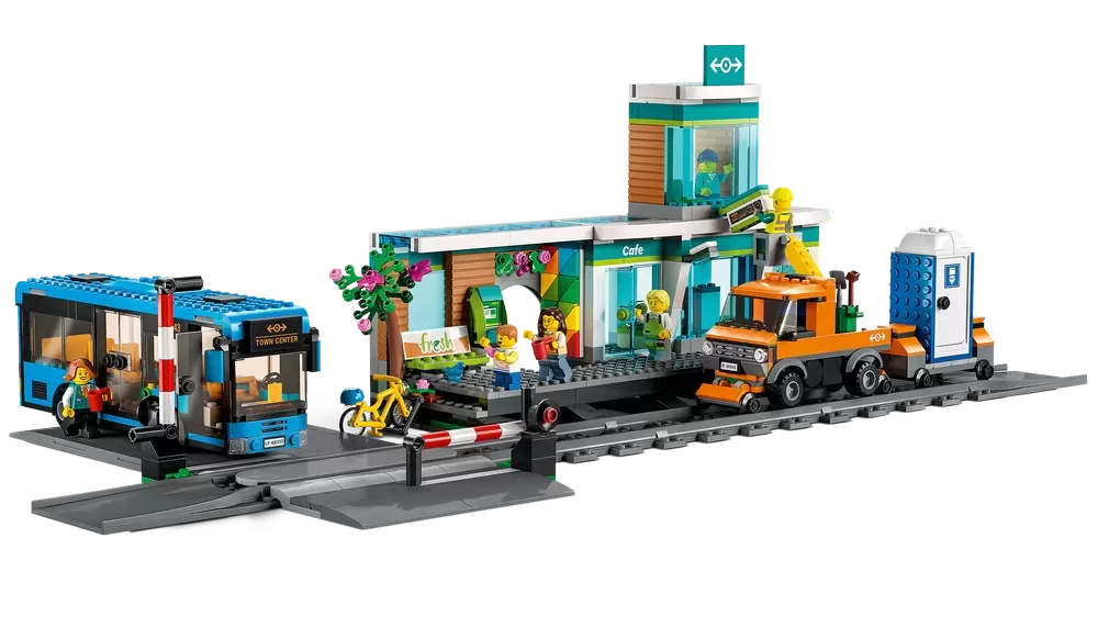 All kids need to build a toy train terminal �C Includes a bus, rail truck, trailer, portable toilet, Road-Plate grade crossing that connects to other LEGO? sets, 4 track pieces and 6 minifigures
