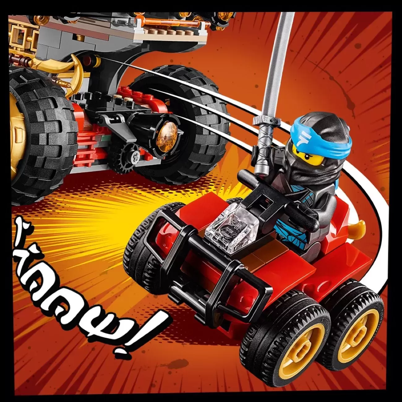 ? Land Bounty ninja truck toy features wheels with gold-colored rims and a steering function, 2 gold-colored shuriken slicers, detachable flyer, rotating shooting cannon, retractable spring-loaded shooter, 2 decorated textile sails (1 on the detachable flyer), detailed interior room with a dual minifigure cockpit, dojo with 2 weapon racks, buildable arcade game, teapot element, and an opening rear compartment with small quad bike.