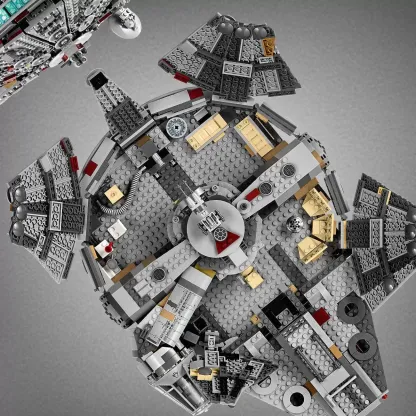- LEGO® Star Wars™ Millennium Falcon model external features include a rotating top and bottom gun turrets (bottom turret fits 2 minifigures), 2 spring-loaded shooters, a lowering ramp and an opening cockpit with space for 2 minifigures.