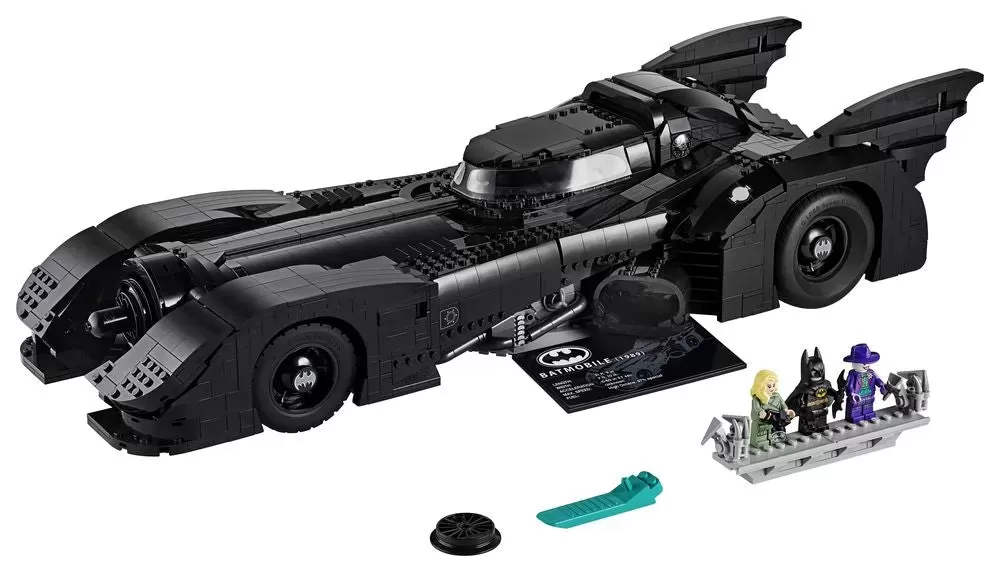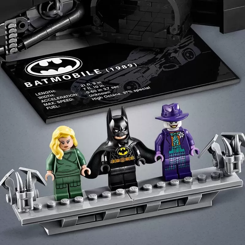 ? This LEGO set also includes a brick-built rotating display stand for the Batman? toy car with an attached information plate with 1989 Batmobile statistics.