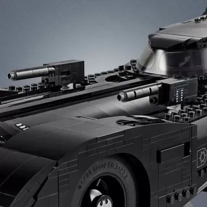 ? This LEGO brick version of the 1989 Batmobile features a slide-open cockpit with a new-for-November-2019 wraparound windshield element, 2 minifigure seats, a steering wheel, stick shift and dashboard stickers, 2 hidden, non-shooting machine guns under the bonnet with a pop-up function activated by rotating the turbine exhaust, 2 decorative grappling hooks, wheel trims with the Bat logo and specially designed tyres for the front wheels, batwings and other iconic design details.