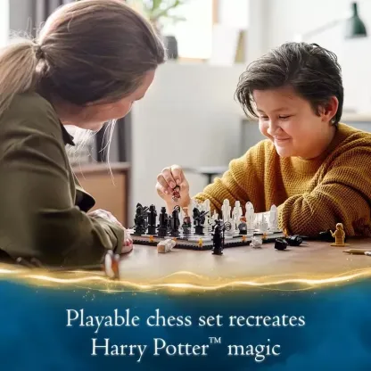 This fascinating chess set provides young witches and wizards with 2 ways to play and stretch their imaginations. It��s an enchanting introduction to the wonderful game of chess, and it��s an authentic recreation of one of the most memorable scenes in Harry Potter and the Sorcerer's Stone?. Kids are sure to be captivated for hours on end �C whether they are enjoying a game of chess or role-playing endless adventures with characters from the magical movies. The set includes Harry Potter, Hermione Granger? and Ron Weasley? minifigures to inspire kids�� creative enjoyment. To celebrate 20 years of magic with LEGO Harry Potter, the set also includes an exclusive, golden Professor Severus Snape? minifigure and 3 random wizard card tiles for kids to collect.