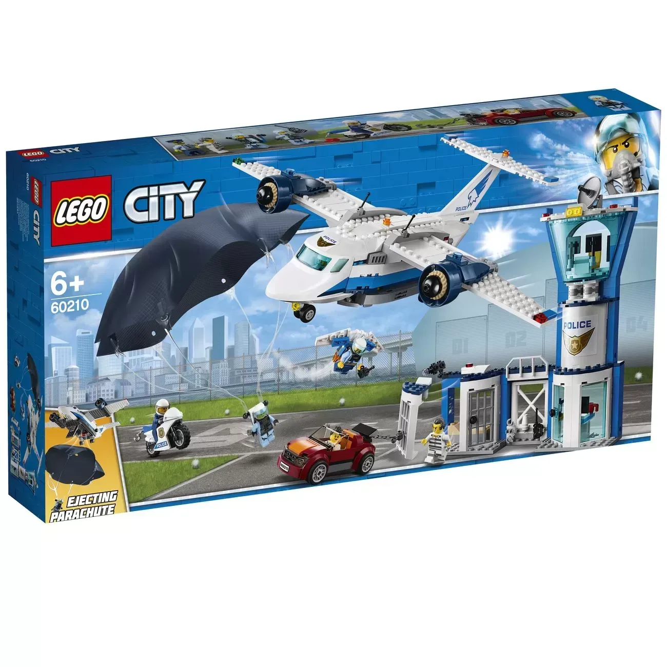 Patrol the LEGO? City streets from above with the highly detailed 60210 Sky Police Air Base toy set, featuring a 3-level police station control tower with jetpack storage, office on the ground floor, attached tool storage area and a jail cell with bed and breakaway wall. This fantastic set also includes a police plane with removable nose cone and hatch underneath to drop the parachute toy, a jetpack with foldable wings, a police motorbike, a getaway car with chain and hook, and 6 minifigures.
