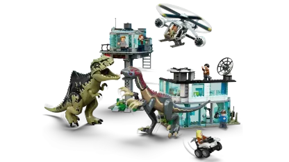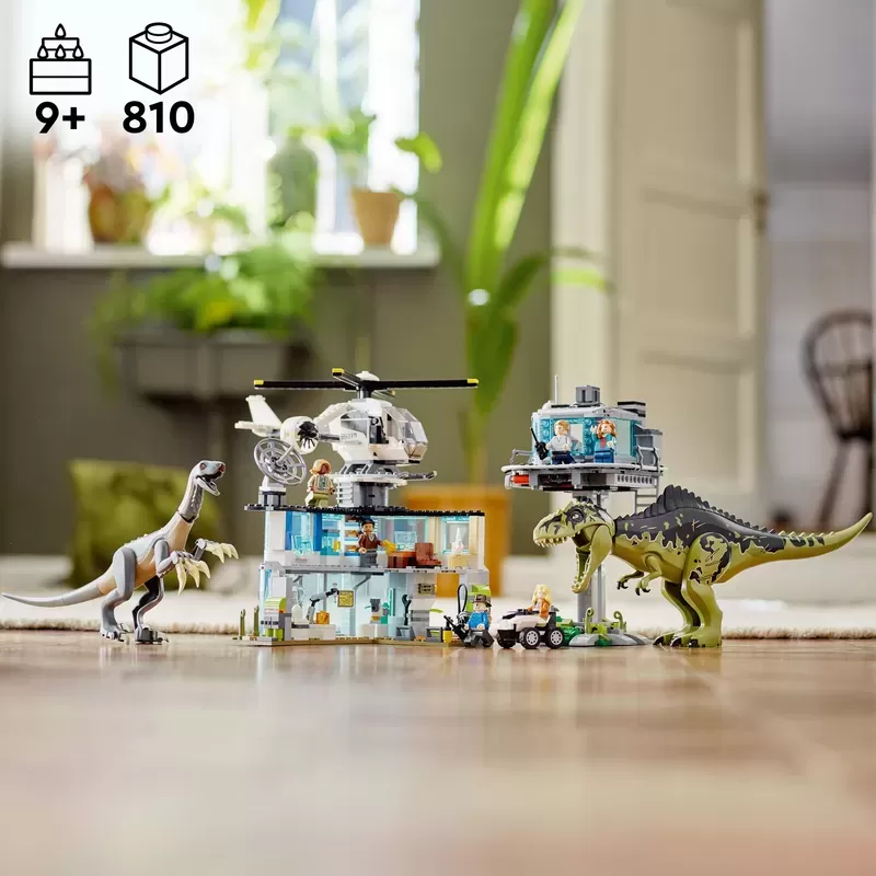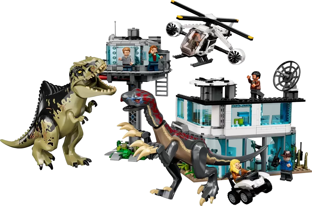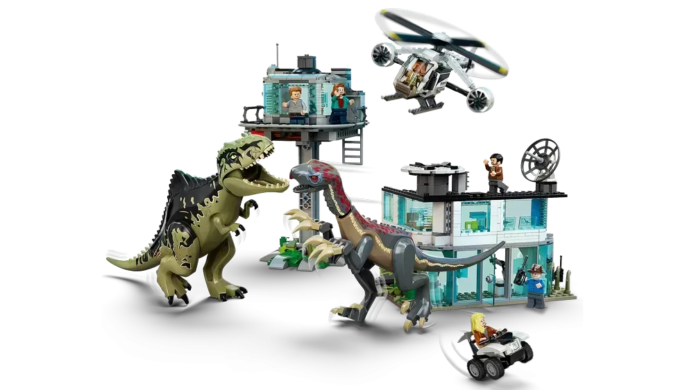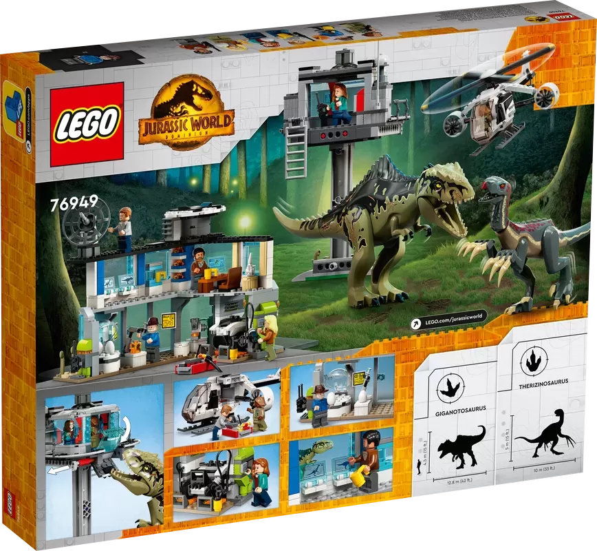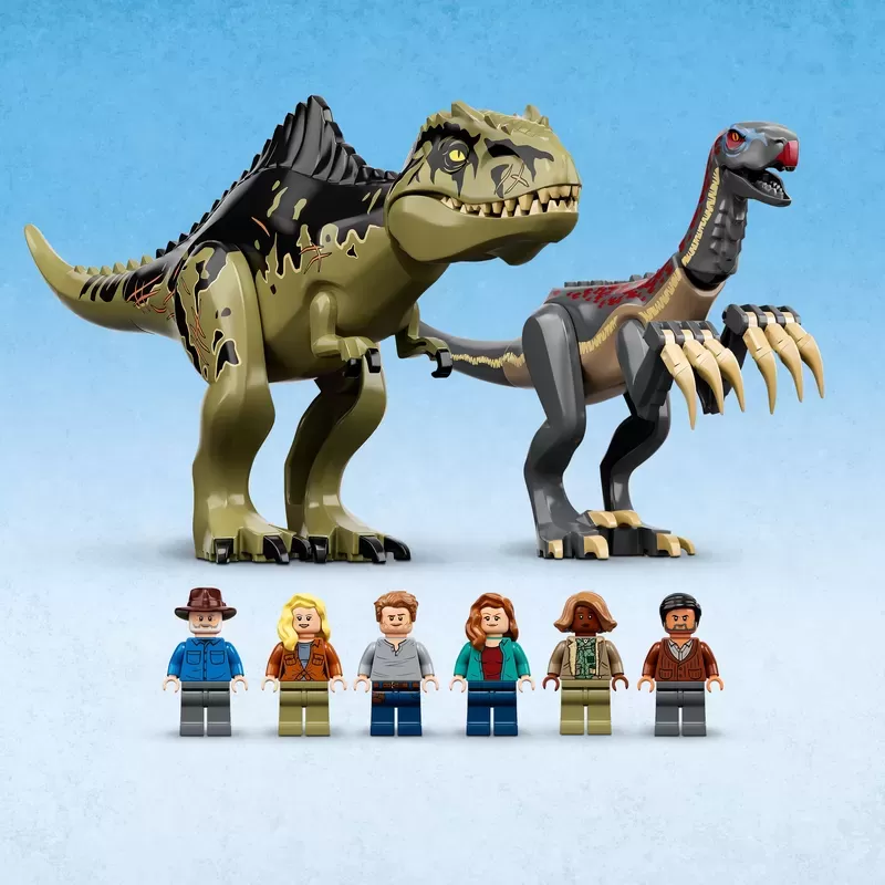 6 minifigures �C Owen Grady, Claire Dearing, Dr. Alan Grant, Dr. Ellie Sattler, Kayla Watts and Dr. Henry Wu, plus a posable Giganotosaurus measuring over 12.5 in. (32cm) long, and a Therizinosaurus