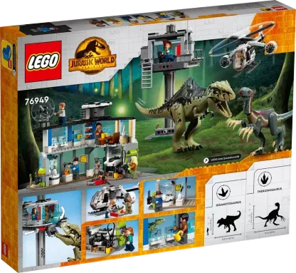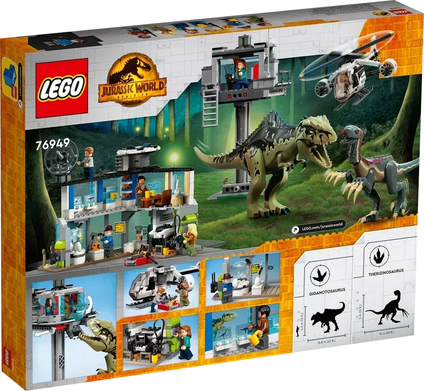 Dinosaur battle toy playset �C Kids can play out dinosaur duels and relive Jurassic World Dominion movie action with this LEGO? Jurassic World Giganotosaurus & Therizinosaurus Attack (76949) set