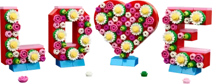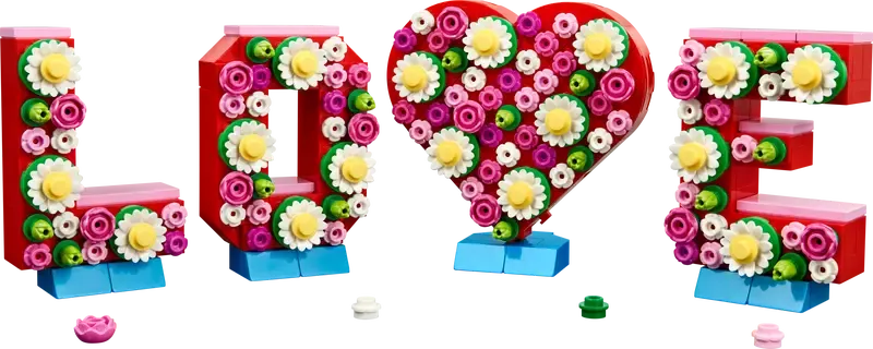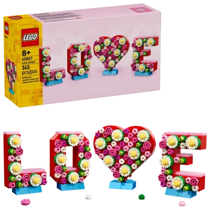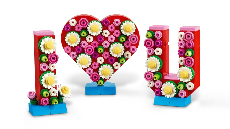 This decor piece includes letters made from pink bricks standing on a blue base that spell the word “love” or “I ‘heart’ U”.